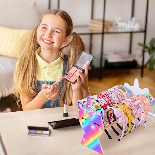 Click for More Images Advantages: Our headband holder is printed with cute unicorn patterns, 2 of the side boards are 5 mm thick, install easier, 5 round wood sticks can ensure firmness and offer more space, two ways for headbands storageSize and...
