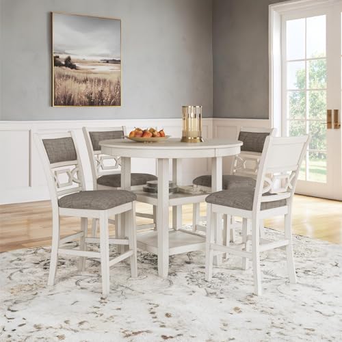 Click for More Images COUNTER HEIGHT TABLE SET: Chic & relaxed, this dining table & bar stool set's timeless design pairs a crisp white finish with light gray textured upholstery. It's a fresh addition everyone will noticeWELL MADE: Table crafted...