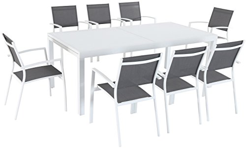 Click for More Images Includes 8 sling chairs and expandable TableAll-weather materials ensure durable qualityTable expands from 78" to 118" whenever neededModern White aluminum framesChairs feature durable gray sling fabric More Information...