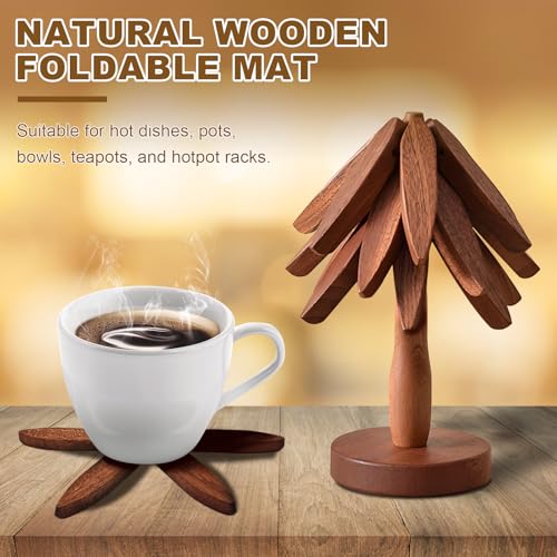 Click for More Images Elegant Tree Trivet Design — Crafted from natural walnut wood, this set includes 4 collapsible trivets and a stand that stores them like a decorative Christmas tree, adding rustic charm to kitchens or dining...