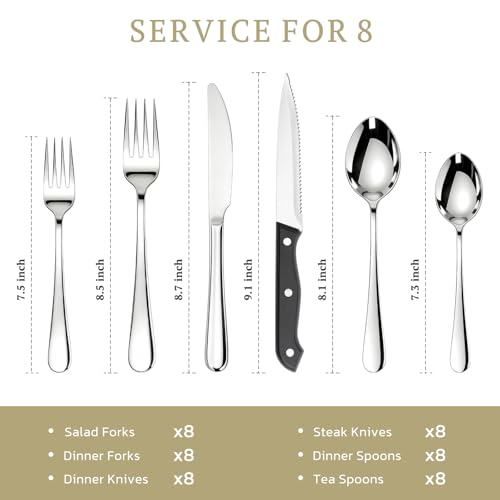 Click for More Images Silverware Set Includes: 30-piece flatware set includes 6 dinner knife(8.9’’/2.81oz),6 dinner fork(8’’/1.6oz),6 dinner spoon(8’’/1.94oz),6 salad fork(6.7’’/1.24oz) and 6 teaspoon(6.7’’/1.28oz),service for...