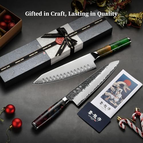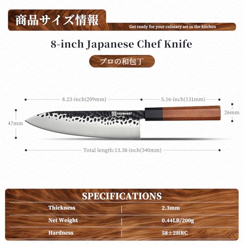 Click for More Images Traditional Japanese Hand-Forged Craftsmanship: This professional Japanese chef's knife combines traditional hand-forging techniques with advanced technology and materials. The blade showcases exquisite hammered textures,...