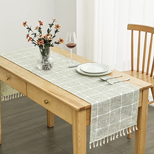 Click for More Images ?PERFECT COMBINATION OF BOHO AND MODERM FARMHOUSE ? The exquisite handmade tassels on both ends of the table runners become the best boho style decoration. Elegant geometric square lattice patterns and sage green bring a...