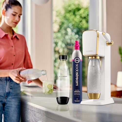 Click for More Images INCLUDES: (1) SodaStream Art Sparkling water maker in White/Gold color, (1) 60L Co2 cylinders, and (1) 1L BPA-Free Dishwasher safe reusable carbonating bottleEnergy efficient, powered by Co2 cylinder. Each Co2 cylinder...