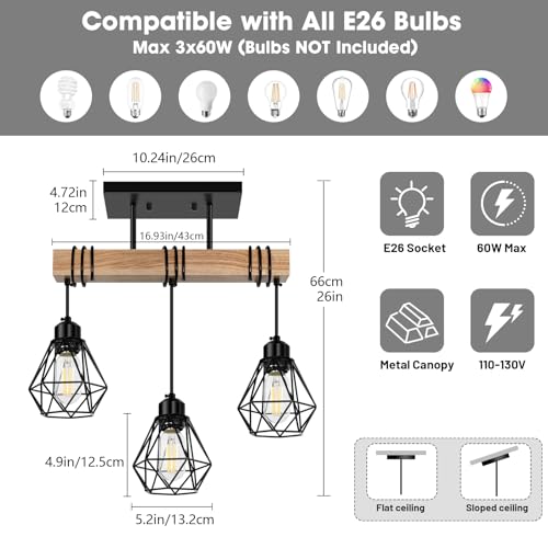 Click for More Images ?Farmhouse Style Pendant Light Fixture?3-light pendant lighting for kitchen with solid wood and black metal finish suit for modern and industrial style. Farmhouse dining table light fixtures with diamond metal shades create...