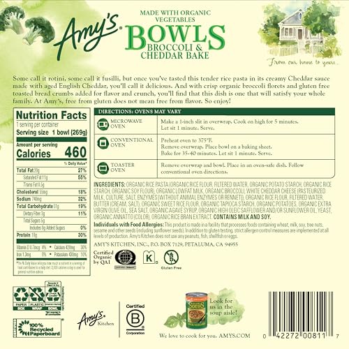 Click for More Images One 9.5-ounce Amy's Broccoli & Cheddar Bake Bowl the whole family will loveMade from scratch with gluten free rice pasta, creamy English Cheddar sauce and crisp organic broccoli floretsTopped with toasted gluten free bread...