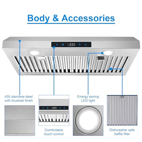 Click for More Images ?Stainless Steel Range Hood?Hood body is made of 430 premium stainless steel with brushed finishing, can be cleaned easily after cooking each time.This range hood comes with two stainless steel baffle filters, endurable and...