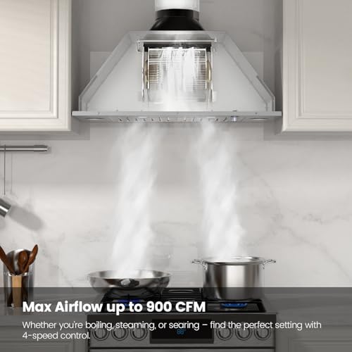 Click for More Images ?900CFM Dual Intake Motor?This 36 inch wall mount range hood features an advanced dual-sided intake system that increases airflow by 40% compared to single-sided motors. The kitchen range hood has a powerful 900 CFM capacity...