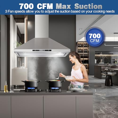 Click for More Images Powerful Suction: Equipped with anti-fire housing premium safe motor that delivers an impressive suction power of 700 CFM, featuring 3-speed settings, this island range hood allows you to easily adapt the airflow to your...