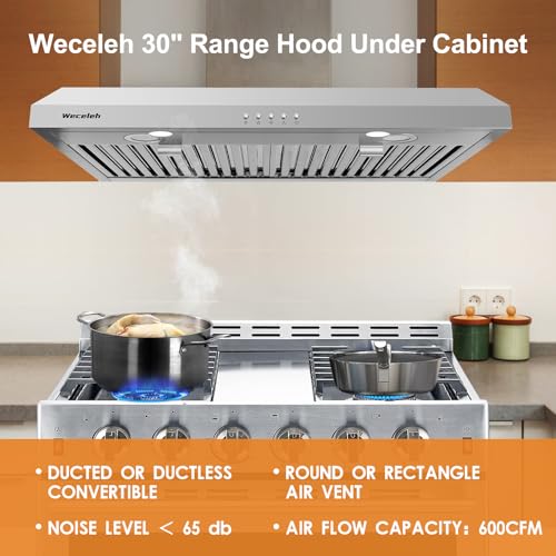 Click for More Images -STYLISH & POWERFUL: The Model 707 Weceleh under cabinet range hood 30 inch is made of premium stainless steel and features a slim design that complements any kitchen style. It boasts a powerful 600 CFM suction capacity and...