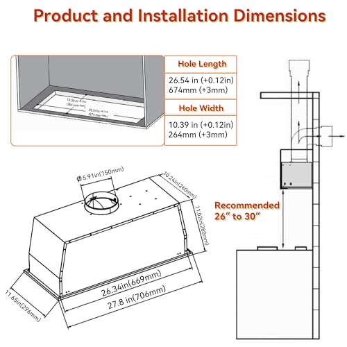 Click for More Images ?Excellent Airflow Capacity for Household Use?JOEAONZ insert range hood achieves higher airflow capacity as much as possible while controlling the noise. Our built-in range hood can still provide a large suction of 800 CFM...