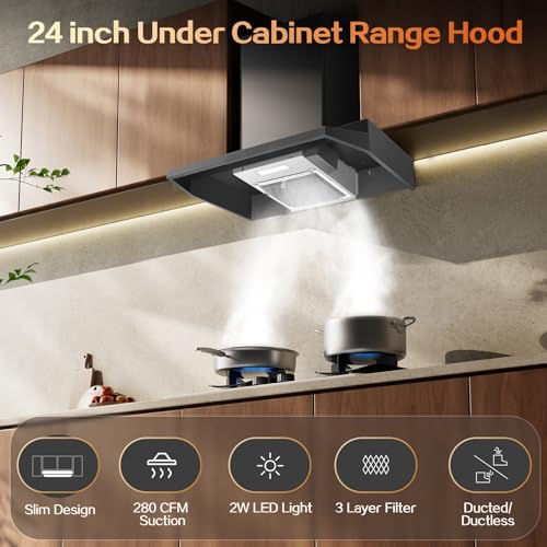 Click for More Images 24 inch Range Hood with Slim Design: With the slim and stainless steel body, this under cabinet range hood is space-saving and easy to install. The rocker button can control 2-speed wind speed and LED lighting, which is easy...