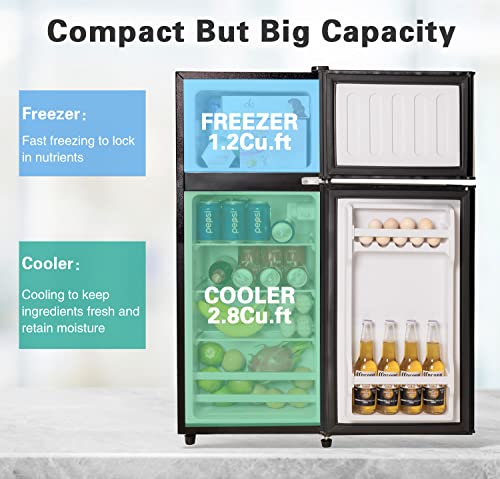 Click for More Images [Large Capacity]? BANGSON mini fridge with freezer is 17.4"×18.7"×33.07" inches and has a capacity of 3.2Cu.Ft. It can store frozen food, cool beer drinks, fresh vegetables, small refrigerator, and freezer that can be...