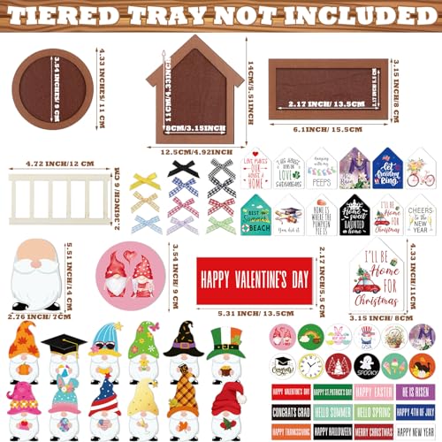 Click for More Images Interchangeable Seasonal Decor Set: the package includes 65 pcs seasonal tiered tray decorations set, containing 1 house frame, 1 rectangular frame, 1 round frame, 1 ladder, 1 gnome ornament, 12 gnome replacement parts, 36...