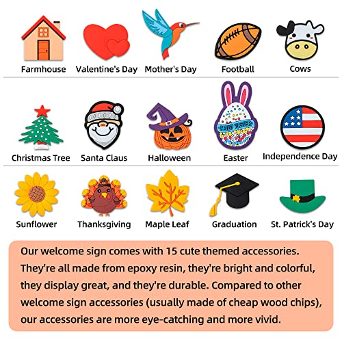 Click for More Images UNIQUE DESIGN: Our welcome sign is the shape of cute mushroom, the letters design with 3D relief effect and attach with 15 interchangeable accessories, showing multi-color decoration effect which more vivid and...