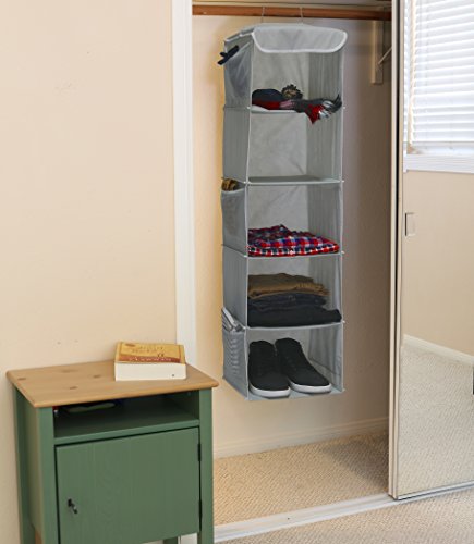 Click for More Images Dimension: 12'' W x 10'' D X 45'' HHangs on standard closet rod, wired closet rack5 Fabric Gray Shelves, dimension of each bin is 12'' W x 10''D x 9''H6 Side Mesh Pockets, each side of this organizer has 3 mesh pockets2...