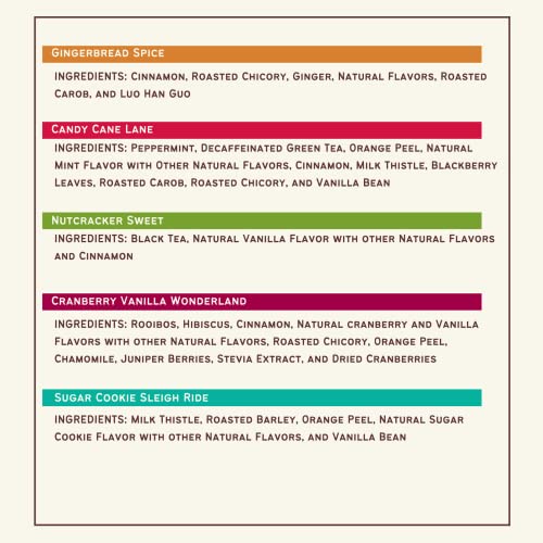 A celebratory Holiday Tea Variety Pack including 5 flavors – Two Candy Cane Lane, Gingerbread Spice, Nutcracker Sweet, Cranberry Vanilla Wonderland, and Sugar Cookie Sleigh Ride.