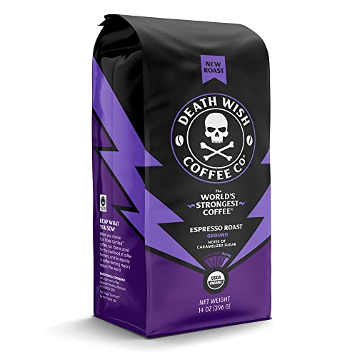 DEATH WISH COFFEE Ground Espresso Roast – Extra Kick of Caffeine – Organic, Fair Trade, Strong Coffee Grounds from Arabica, Robusta (1-Pack)