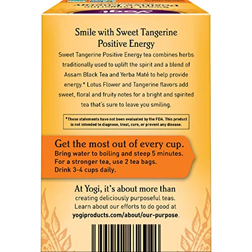 Flavor: Yogi Sweet Tangerine Positive Energy tea combines bold Assam Black Tea with Organic Tangerine and Lotus Flower Flavors for a delightfully sweet and citrusy blend.