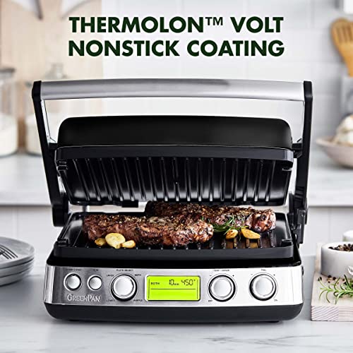 GreenPan Elite 7-in-1 Multi-Function Contact Grill & Griddle, Healthy Ceramic Nonstick Aluminum, Two Sets of Grill & Waffle Plates, Adjustable Shade & Shear, Closed Press/Open Flat Surface, Black