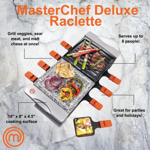 MasterChef Dual Raclette Table Grill w Non-Stick Grilling Plate & Cooking Stone- 8 Person Electric Tabletop Cooker for Korean BBQ-Melt Cheese, Cook Meat & Veggies at Once-(19″ x 8″)Gift, Holiday Party