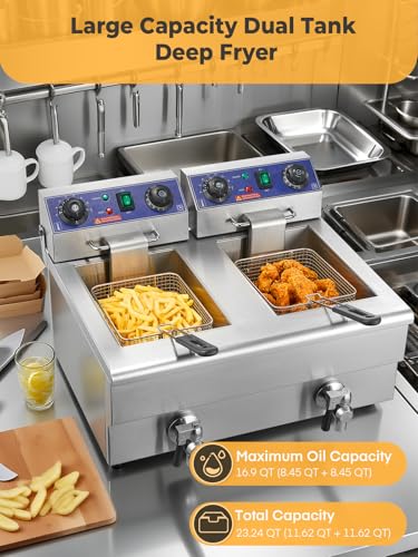• ?Large capacity design?: This 23.3QT electric deep fryer features a dual oil tank design (Water Capacity: Max 11.6Qt/11L each, Oil Capacity: Max 8.5Qt/8L each) . It can fry various snacks like chicken wings, French fries, and onion rings, ideal for food trucks, snack bars, family gatherings, and parties.
