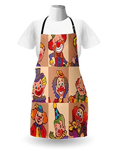 Lunarable Circus Apron, Funny Clowns Illustration Print Entertaining Joke Enjoyment Theme, Unisex Kitchen Bib with Adjustable Neck for Cooking Gardening, Adult Size, Coral Red