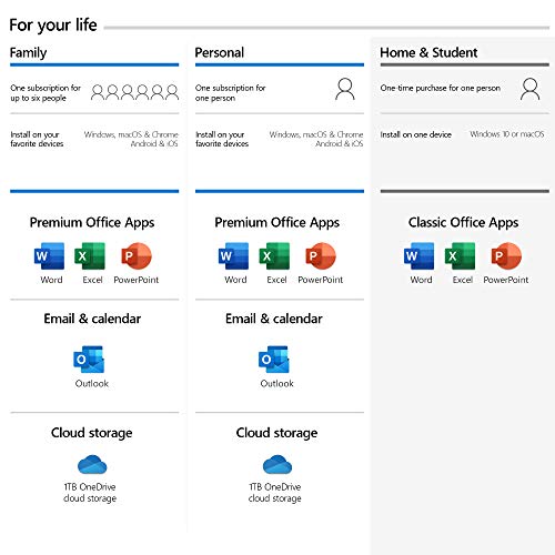 Classic 2019 versions of Word, Excel and PowerPoint; Plus, additional OneNote features (features vary, visit aka.ms/onenote office2019 faq)