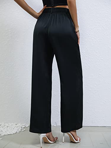 SweatyRocks Women’s Pleated High Waist Satin Wide Leg Pants Casual Work Office Long Trousers with Pockets Black S