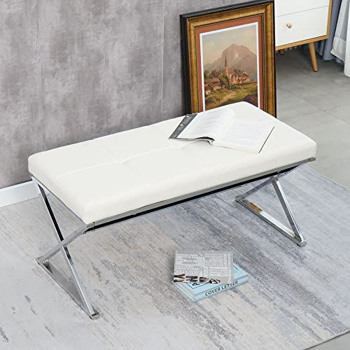 Wlvos Long PU Leather Bench, Modern Dining Room Living Room Bench with Mirror Silver Stainless Steel Legs, White