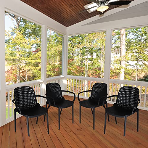 Four plastic resin stackable dining arm chairs that will instantly transform any porch, patio or outdoor dining area, use indoors at dining table or for extra seating