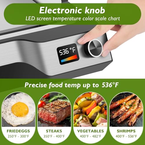 Smart Temperature Control with Visual Guide: The pancake griddle features an electronic knob and an intuitive color temperature chart for precise temperature control, freeing you from constant monitoring. Even beginners can easily prepare delicious dishes by following recipe-recommended settings, significantly boosting cooking confidence and enjoyment