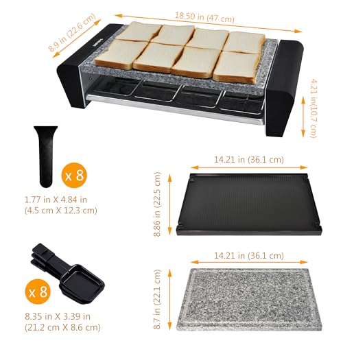 High Power And Multi-Function:Raclette table grill for 4-8 person, 18.5*8.9*4.2 inches. 1300 W, 120V, 60 Hz. Can melt cheese, cook up meats, steak, hamburgers, pizza, seafood, veggies and more quickly. Includes 8 pcs cheese melting pans and spatulas, suitable for 4-8 person, everyone can make and enjoy tasty bites according to their different needs. Raclette grill stone, is a must-have cooking or grilliing helper for home kitchen