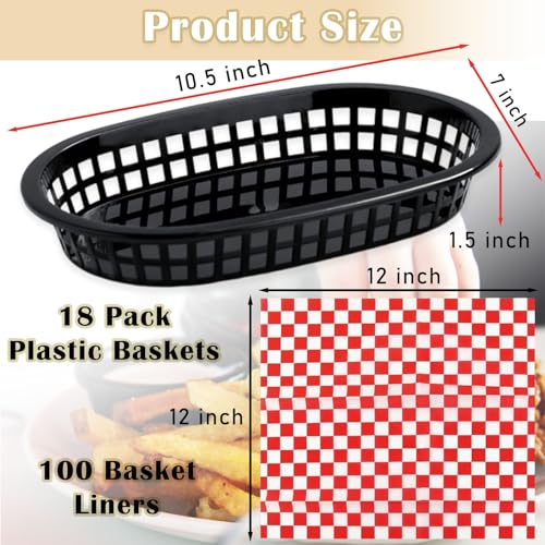 Ralahbeifm 18 Pack Plastic Fast Food Baskets with 100 Sheets, 10.5 x 7 Inch Oval Food Baskets and Liners Reusable Chip Basket for Burgers, Sandwiches, Barbecues Serving Black