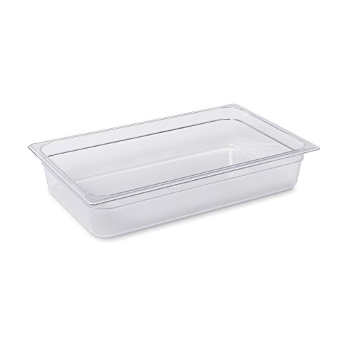 The Rubbermaid Commercial Products Cold Food Insert Pan for Restaurants/Kitchens/Cafeterias, Full Size, 4 Inches Deep, Clear (FG131P00CLR) fits 1/2 size spots on a gastronorm modular system at 2.5 inches deep. The clear, break-resistant polycarbonate won’t rust, dent, or bend. it is significantly quieter than metal when inserting or removing pans from foodservice racks, carriers, and stations. Heavy-duty plastic material is cooler to the touch than metal versions. It has non-stick surfaces for easy food release, effortless cleaning. Food refuse does not stick or leave odors on the polycarbonate containers. All pans, lids, and trays are commercial dishwasher and microwave safe. All pans comply with gastronorm specifications for food racks, carts, and stations. Temperature rated from -40°F to 212°F (-40°C to 100°C). Made of FDA compliant materials and meets NSF #2 standards.