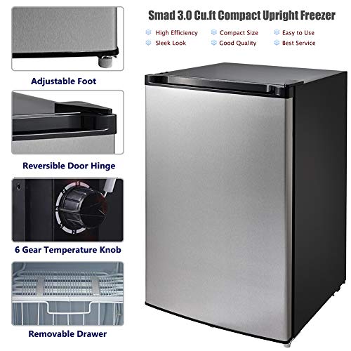 Smad 3.0 Cu.ft Upright Freezer with Reversible Single Door Compact Small Freezer for Office Dorm Apartment, with Removable Basket, Stainless Steel