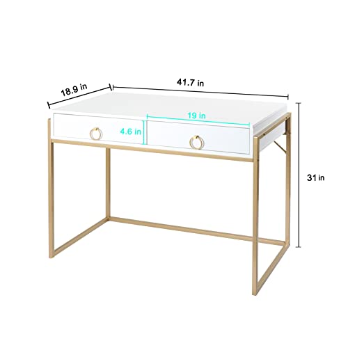 Anmytek Home Office Writing Desk 2 Drawers Storage, Contemporary Makeup Vanity Table Study Desk, W/Matte White and Gold Finish Frame D0003