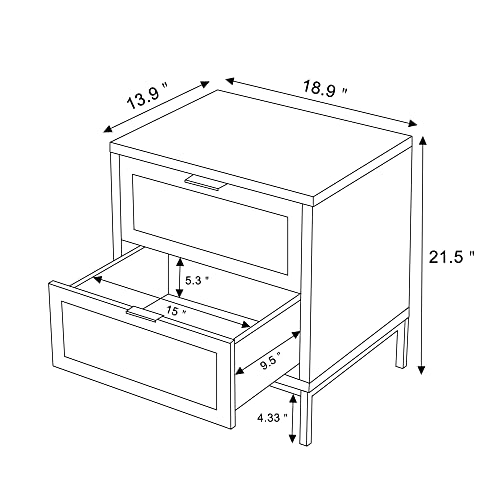SPECIFICATIONS: The overall dimensions of the modern sofa side table is 18.9″D x 13.9″W x 21.5″H. The size of the rattan drawer is 15″D x 9.5″W x 5.3″H.