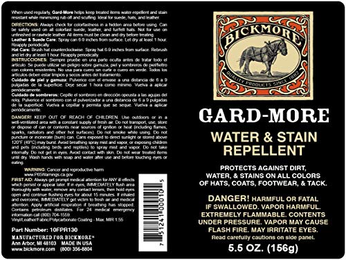 SUPERIOR WATERPROOF TREATMENT- Bickmore’s Gard-More Water & Stain Repellent has been specially formulated to add a protective layer to your valued goods helping guard against water and stains while minimizing rub off and scuffing.