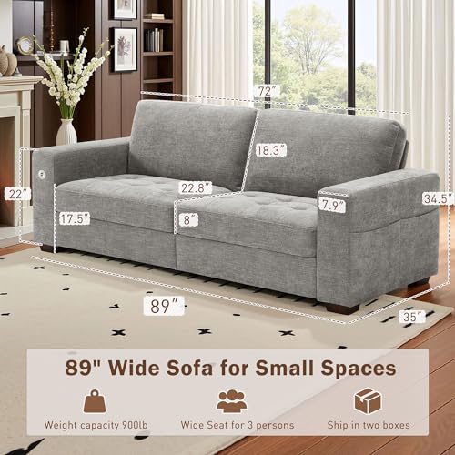 Hanherry Couch for Living Room, Modern Comfy Sofa with Medium Firm Seat Cushion, Removable Cover,Wide Armrest,USB/Type-C Port,Chenille Fabric Couches for Small Space,Apartment (Gray, 89 inch)