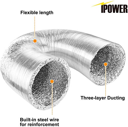 iPower Flexible 4 Inch Non-Insulated Flex Air Aluminum Foil Ducting Dryer Vent Hose 25 Feet Long for HVAC Heating Cooling Ventilation and Exhaust, 2 Stainless Steel Clamps Included
