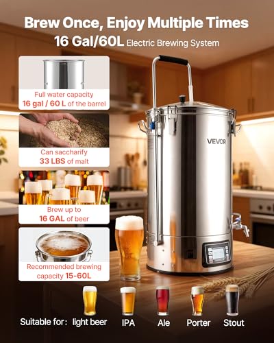 Large Capacity Brewing: This electric brewing system features a 16 gal / 60 L tank with a total brewing volume of 16 gallons. It can mash up to 33.07 lbs of malt per batch—ideal for home gatherings or small commercial use. Brew lager, IPA, ale, porter, or stout for true beer freedom