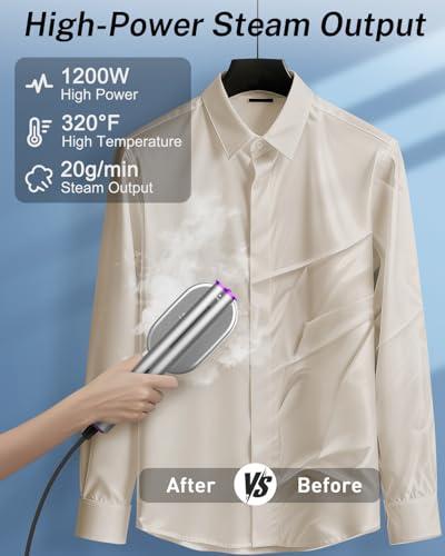 Fast 10-Second Heat-Up: The 1200W design delivers powerful 20 g/min steam within seconds. This hand held steamer, handheld steamer, and hand held steamers for clothes quickly removes wrinkles from shirts, coats, and more. Safe and effective for multiple fabrics including cotton, silks, linen, wool, chiffon, denim, nylon, polyester. Whether used as a home tool or travel steamer for clothes portable mini, it ensures fast, reliable results every time