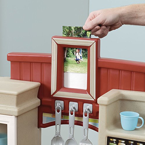 Play features include white wipe-off board on pretend refrigerator, photo frame, 41 piece kitchen accessory set and plenty of storage