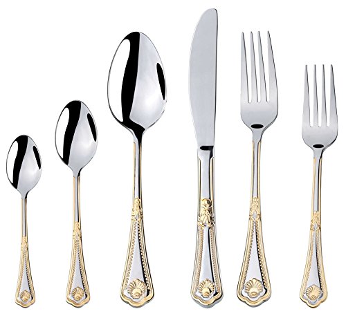 Italian Collection ‘Seashell’ 75-P? Premium Flatware Set w/Wooden Storage Case, Dining Cutlery Service for 12, 24K Gold plated 18/10 Stainless Steel Hostess Serving Set in a Chest