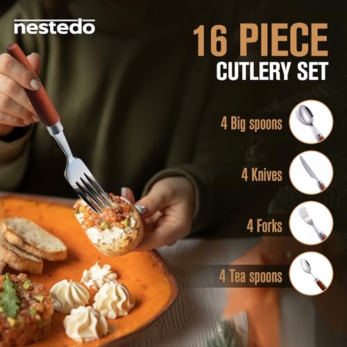 Wood Handle Silverware Set – 16-Piece Flatware for 4, Modern Rustic Cutlery with Natural Wood Handles & Stainless Steel Utensils