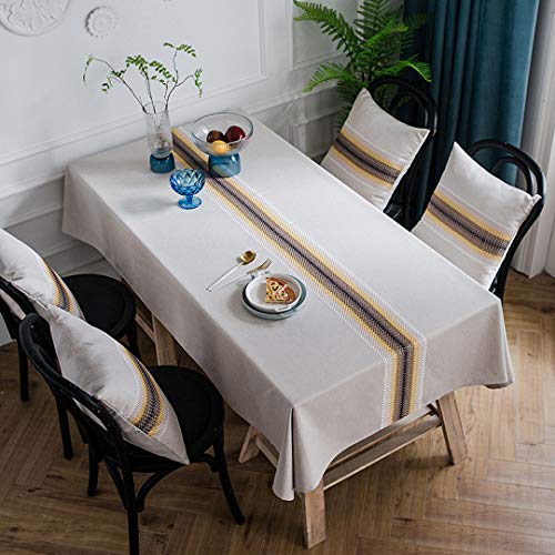 Bringsine Embroidery Tablecloth Heavy Weight Cotton Linen Fabric Dust-Proof Water-Proof Table Cloth Cover for Kitchen Dinning Tabletop Deco Yellow and White Line(Rectangle/Oblong, 53 x 102Inch)