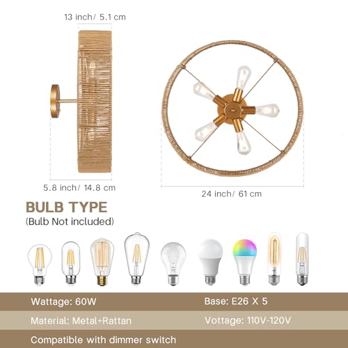 ?Dimmable & Compatible?This rattan ceiling light is designed with five E26 sockets (bulbs not included), compatible with dimmable, LED, and incandescent bulbs, allowing you to adjust the brightness to suit your mood. Ideal for creating the perfect ambiance in bedrooms, entryways, and any other room in your home.