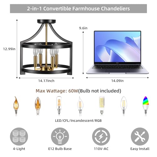 ??E12 Bulbs & Dimmable?Hanging light fixture require 4xE12 basic bulbs (Bulbs Not Included), each with a maximum wattage of 60 watts, compatible with incandescent, Edison,LED, CFL,and halogen bulbs, and can be fully dimmed when used with dimmable bulbs and compatible dimming switch (Switch Not Included).The foyer lighting fixtures can be dimmed to achieve any lighting effect you want