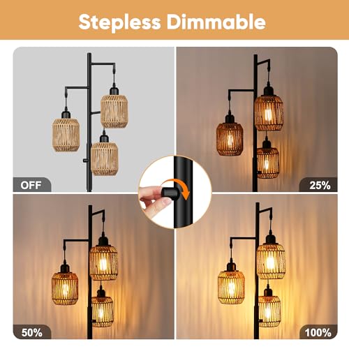 ROTTOGOON Dimmable Boho Floor Lamp – 3 Light Farmhouse Rattan Floor Lamp for Living Room, Industrial Tree Floor Lamps with 3 X 6W LED Bulbs, Rustic Standing Tall Lamp for Bedroom, Office, 68″, Black